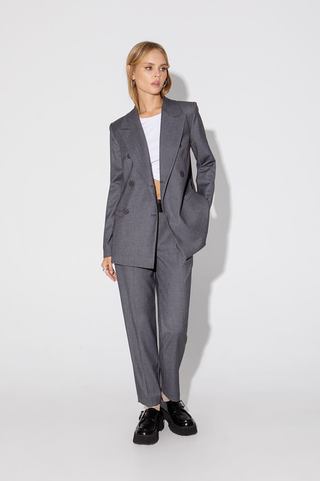 Классический костюм-двойка из двубортного жакета и укороченных брюк со стрелками. Детали: жакет полуприлегающего силуэта, пиджачный воротник, перед с прорезными карманами, двубортная застежка на петли и пуговицы, спинка со средним швом, рукава втачные двухшовные, жакет на подкладке. Брюки со средней посадкой, притачной пояс со шлевками, передние половины с небольшими мягкими складками и заутюженными стрелками, застежка на молнию и пуговицу, боковые карманы.