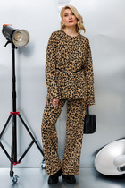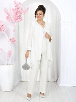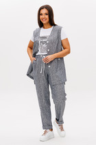 Длина жакета по спинке около 72 см в размерах 40-46 и около 74 см в размерах 48-52, длина рукавов около 62,5 см. Длина брюк по боковому шву с поясом около 99 см в размерах 40-46 и около 100,5 см в размерах 48-52, длина по внутреннему шву около 69,5 см.