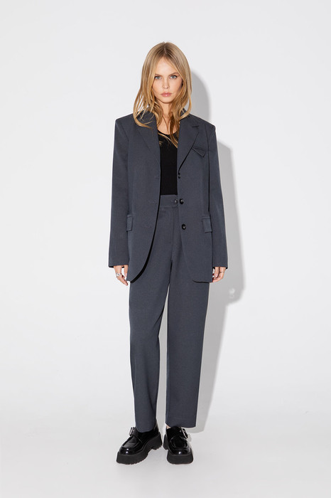 Текстильный костюм-двойка из свободного жакета и укороченных брюк с резинкой по поясу. Детали: жакет прямого силуэта, пиджачный воротник, перед с прорезными функциональными карманами, нагрудный декоративный карман, однобортная застежка на петли и пуговицы, спинка со средним швом, рукава втачные двухшовные с разрезами по низу, жакет на подкладке. Брюки с высокой посадкой, притачной пояс со шлевками, задняя часть пояса эластичная- с резинкой, застежка на молнию и пуговицу, боковые карманы, передние половины с двумя складками.