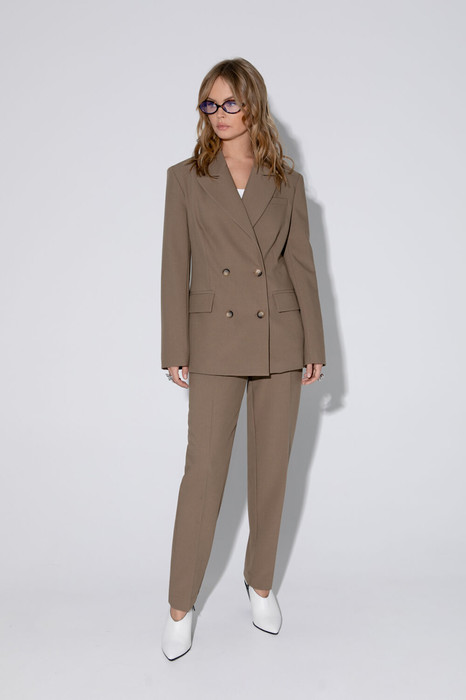 Костюм-двойка из свободного двубортного жакета и классических-брюк из текстильной ткани.
