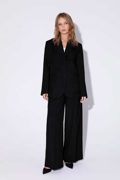 Костюм-двойка из оверсайз жакета с бантиками и брюк-палаццо.