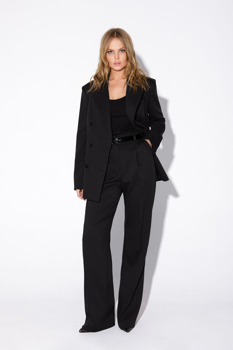 Детали: жакет свободного покроя и полуприлегающего силуэта, двубортная застежка на петли и пуговицы, отрезные бочки, пиджачный воротник, функциональные карманы, жакет на подкладке. Брюки с высокой посадкой, притачной пояс со шлевками, передние половины с небольшими застроченными мягкими складками и заутюженными стрелками, застежка на молнию и пуговицу, боковые карманы. Задние части брюк с вытачками и заутюженными стрелками. Пояс брюк прямой, без резинки.
