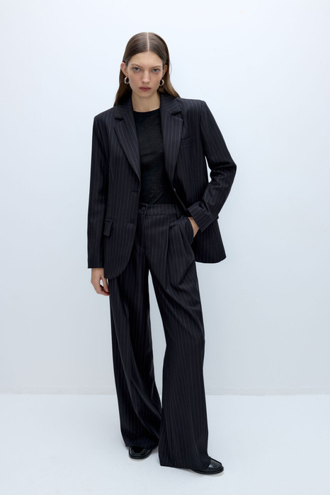 Костюм-двойка в тонкую полоску из оверсайз жакета и брюк-палаццо со складками.