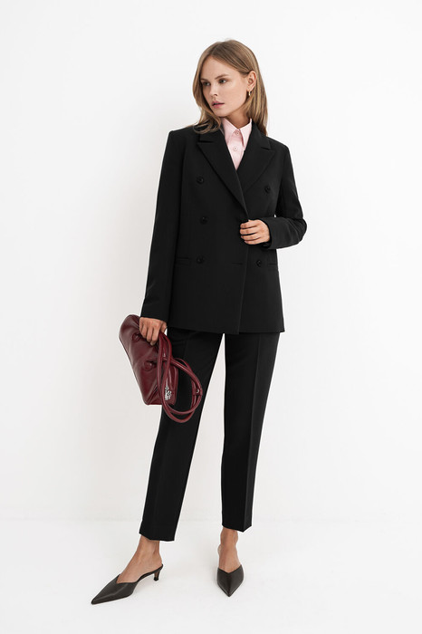 Текстильный костюм-двойка из двубортного жакета и укороченных брюк со средней посадкой.