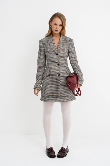 Костюм-двойка из удлиненного приталенного жакета и мини-юбки из текстильной ткани с рисунком «гусиная лапка».
