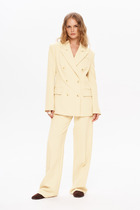 Детали: жакет прямого силуэта, пиджачный воротник, перед с прорезными функциональными карманами, нагрудный декоративный карман, однобортная застежка на петли и пуговицы, спинка со средним швом, рукава втачные двухшовные со шлицами, жакет на подкладке. Брюки с высокой посадкой, притачной пояс с резинкой и шнурами, без застежки, боковые карманы, передние части брюк с глубокой складкой у пояса.