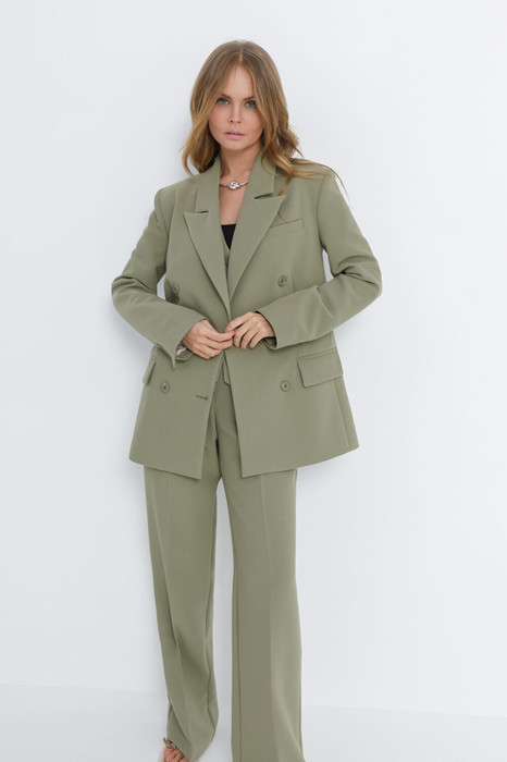 Детали: жакет свободного покроя и полуприлегающего силуэта, двубортная застежка на петли и пуговицы, отрезные бочки, пиджачный воротник, функциональные карманы, жакет на подкладке. Брюки с высокой посадкой, притачной пояс со шлевками, передние половины с небольшими застроченными мягкими складками и заутюженными стрелками, застежка на молнию и пуговицу, боковые карманы. Задние части брюк с вытачками и заутюженными стрелками. Пояс брюк прямой, без резинки.