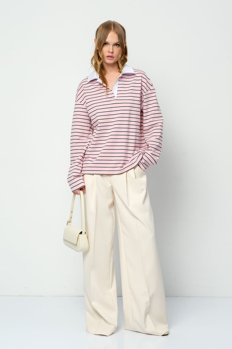 Комплект-двойка из свободного трикотажного поло в полоску и текстильных брюк-палаццо.