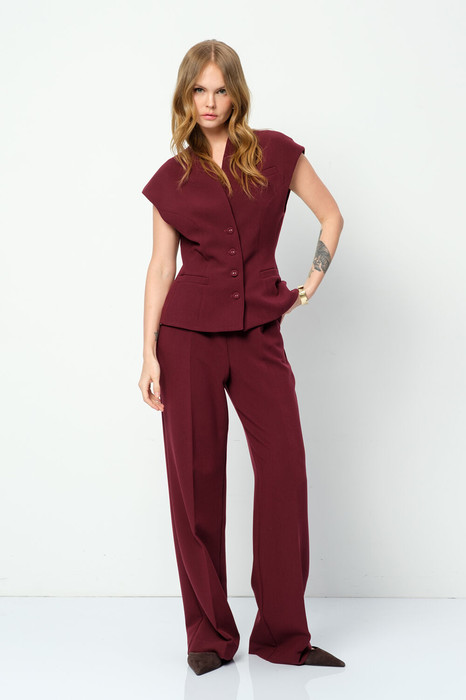 Костюм-двойка из приталенного жилета с воротником-стойкой и широких прямых брюк из текстильной ткани.