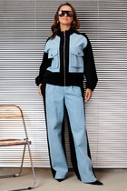 Костюм-тройка из оверсайз жакета, топа-корсета и прямых широких брюк со стрелками.