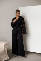 Детали: жакет свободного покроя и полуприлегающего силуэта, двубортная застежка на петли и пуговицы, отрезные бочки, пиджачный воротник, функциональные карманы, съемный пояс. Жакет на подкладке. Брюки с высокой посадкой, притачной пояс со шлевками, передние половины с небольшими застроченными мягкими складками и заутюженными стрелками, застежка на молнию и пуговицу, боковые карманы. Задние части брюк с вытачками и заутюженными стрелками. Пояс брюк прямой, без резинки.