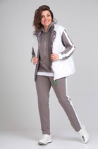 Детали: полуприлегающий силуэт, цельнокроеный воротник-стойка, рельефные швы переда и спинки, функциональные карманы, застежка на петли и пуговицы, жилет на подкладке. Брюки с притачным поясом со шлевками, передние половины с небольшими застроченными мягкими складками и заутюженными стрелками, застежка на молнию и пуговицу, боковые карманы. Задние части брюк с вытачками и заутюженными стрелками. Пояс брюк прямой, без резинки.