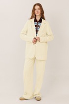 Костюм-двойка из двубортного полуприлегающего жакета и прямых широких брюк со стрелками.