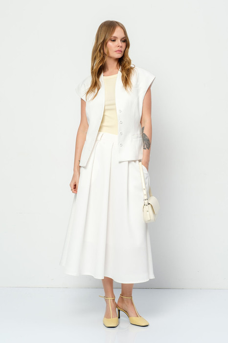 Костюм-двойка из приталенного жилета с воротником-стойкой и миди-юбки в складку.