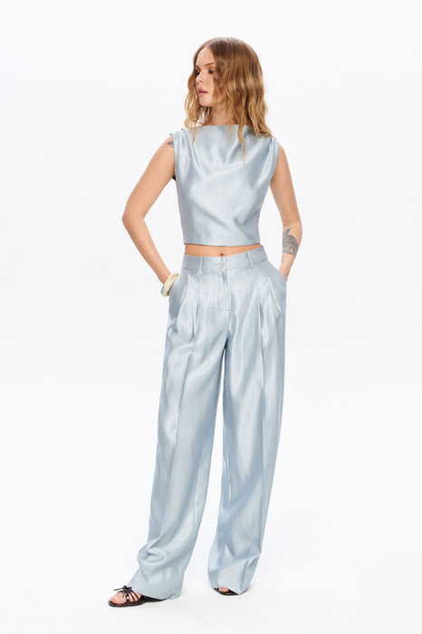 Детали: полуприлегающий силуэт, вырез переда- «качели», топ на подкладке, при помощи поясов можно регулировать прилегание. Также пояса можно завязать спереди. Брюки с притачным поясом со шлевками, складки у пояса, застежка на молнию и пуговицу, боковые карманы. Задние части брюк с вытачками и имитацией карманов.
