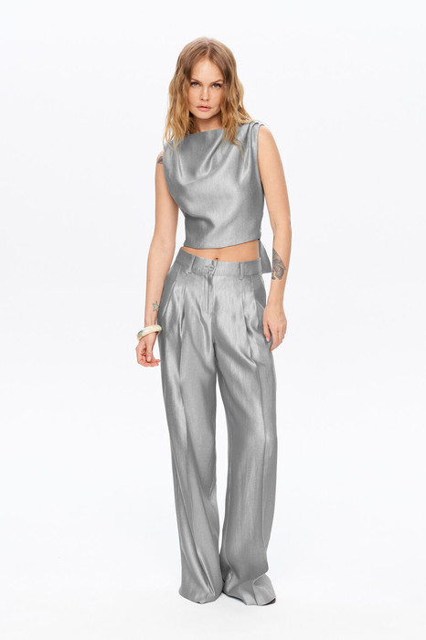 Детали: полуприлегающий силуэт, вырез переда- «качели», топ на подкладке, при помощи поясов можно регулировать прилегание. Также пояса можно завязать спереди. Брюки с притачным поясом со шлевками, складки у пояса, застежка на молнию и пуговицу, боковые карманы. Задние части брюк с вытачками и имитацией карманов.