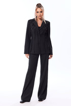 Костюм-двойка из приталенного жакета с молниями и укороченных классических брюк со стрелками.