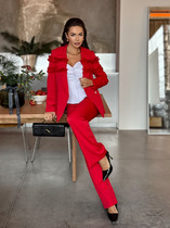 Трикотажный костюм-двойка из асимметричной туники и облегающих брюк-клеш.