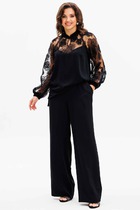 Детали: жакет прямого силуэта, свободный покрой, расширенная линия плеч, пиджачный воротник, перед с прорезными функциональными карманами, однобортная застежка на петли и пуговицы, спинка со средним швом и шлицей, рукава втачные двухшовные, жакет на подкладке. Юбка с высокой посадкой, талиевые вытачки, застежка сзади на потайную молнию, на подкладке.