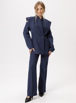 Костюм-двойка из приталенного двубортного жакета и облегающих брюк-клёш со стрелками.