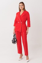 Детали: жилет приталенного силуэта, асимметричный воротник, отрезная линия талии со складками, спущенное плечо, функциональные карманы, застежка на петли и пуговицы, съемный пояс, жилет на подкладке. Брюки с высокой посадкой, притачной пояс со шлевками, передние половины с небольшими застроченными мягкими складками и заутюженными стрелками, застежка на молнию и пуговицу, боковые карманы. Задние части брюк с вытачками и заутюженными стрелками. Пояс брюк прямой, без резинки.