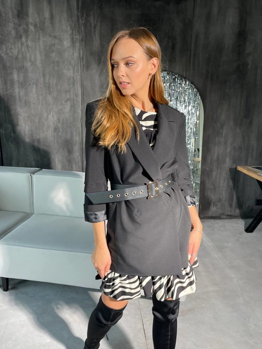 Жакет прямого кроя, на подкладке, застегивается на потайную кнопку изнутри. На рукаве зафиксированные складки. Ремень в комплекте. Жакет 76 см, рукав 47 см. Платье 83 см.(свободный силуэт)