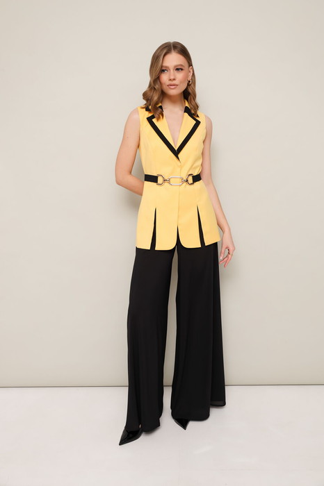Элегантный комплект, состоящий из жилета и брюкпалаццо. Жилет полуприлегающего силуэта на х/б подкладке с воротником пиджачного типа с контрастной окантовкой. Центральная застежка на потайные кнопки. Перед с рельефами, переходящими в разрезы в нижней части жилета. Струящиеся брюки-палаццо свободного силуэта с расклешением от бедра, на притачном поясе, с застёжкой на потайную молнию в боковом шве. Брюки на частичной подкладке. В комплекте прилагается акцентный пояс на резинке с застежкой на кнопки.