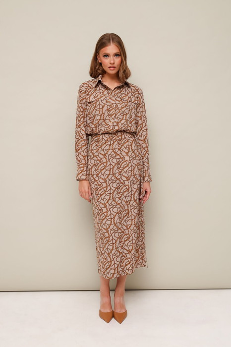 Комплект 2-предметный, состоящий из блузки и юбки на запах. Блузка прямого кроя, горловина обработана воротником на стойке, застежка на притачной планке на петли и пуговицы. Перед блузки с накладными карманами с клапанами. Рукава длинные с притачной манжетой с застежкой на пуговицы. В боковых швах обработаны разрезы. Юбка на запах в длине миди. Притачной пояс с застежкой на полукольца, внутри фиксируется на пришивные кнопки.