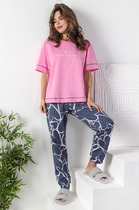 Блузка и юбка, выполнены из вискозного полотна. Блузка прямого кроя, горловина с рубашечным воротником на отрезной стойке, центральная застежка на петли и обтяжные пуговицы. Рукава втачные с манжетами с застежкой на пуговицы. В боковых швах обработаны разрезы. Спинка с отрезной кокеткой и встречной складкой.