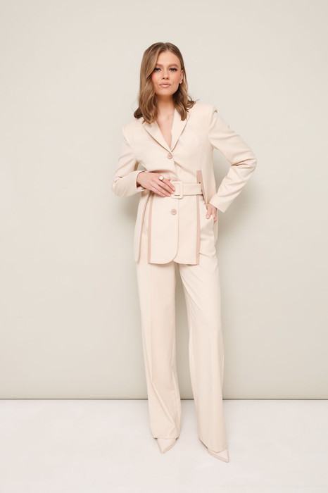 Комплект 2-предметный, состоящий из жакета и брюк, выполненный из костюмной ткани. Жакет полуприлегающего силуэта, с центральной застежкой на петли и пуговицы. Воротник пиджачного типа с отложными лацканами, край борта скругленный по низу жакета. В рельефных швах переда обработаны высокие разрезы с отделочными деталями. Рукава втачные, двухшовные. Спинка со средним швом. Жакет на подкладке. Брюки прямого силуэта с заутюженными стрелками и с боковыми наклонными карманами. Пояс притачной с застежкой на пуговицу и тесьму-молнию, по спинке пояс на резинке для регуляции размера. В комплекте прилагается ремень из основной ткани с обтяжной пряжкой.