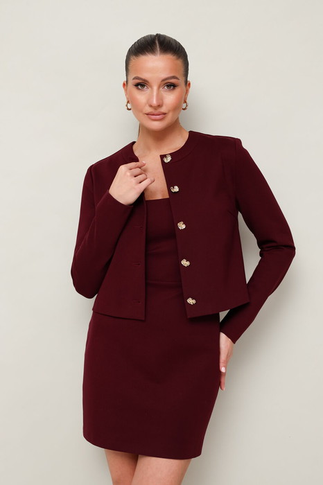 Жакет полуприлегающего силуэта, с центральной застёжкой на петли и акцентные пуговицы. Длинные втачные рукава. Спинка со средним швом.