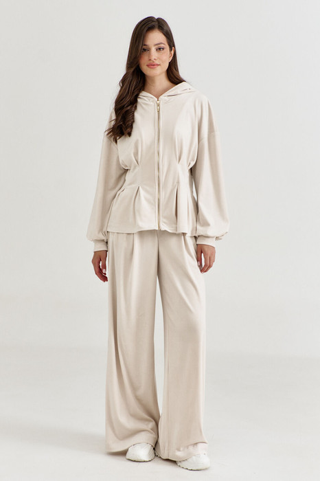 Костюм, состоящий из джемпера и брюк. Джемпер полуприлегающего силуэта, длиной до бедер. Прилегание по талии достигнуто за счет встречных складок. Рукава одношовные, втачные, по низу с притачной манжетой. По горловине вставлен капюшон. По переду застежка на декоративную тесьму-«молнию». По молнии вставлен кант из контрастной ткани. Джемпер без подкладки. Брюки длинные, расширенные к низу, на притачном поясе с резинкой. На передних половинках заложены встречные складки и обработаны карманы с листочкой. В боковые швы вставлен кант из отделочной ткани. Брюки без застежки.