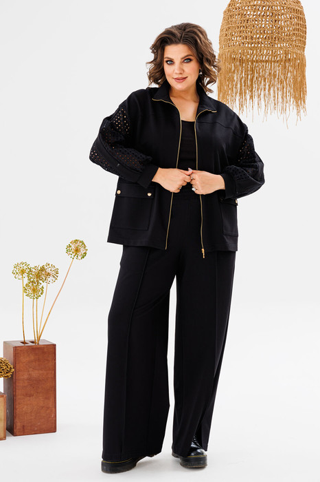 Костюм предназначен для повседневной носки. Костюм женский 2-х предметный жакет брюки. Жакет женский прямого силуэта, длиной ниже линии бёдер. Перед с 2-мя отрезными кокетками, с 2-мя прямоугольными накладными карманами, фиксирующимся к карманам на металлические кнопки. Спинка цельнокроеная. Горловина круглая с втачной стойкой. Застёжка центральная бортовая на разъёмную тесьму-молнию. Жакет со спущенным плечом. Рукав втачной из отделочной ткани с притачной планкой по центру, длинный, низ рукава со сборкой и притачной манжетой. Жакет без плечевых накладок. Брюки женские длинные прямые. Передние половинки с карманами в боковых швах, с декорированными защипами по центру шириной 0,5 см. Задние половинки с таллиевыми вытачками. Боковые швы с разрезами. Брюки с притачным поясом, собранным на эластичную тесьму, закреплённую 2-мя отделочными строчками. Длина спинки жакета 62 см, длина рукава 51 см, ширина плеча 24 см. Дина брюк по боковому срезу 102 см.