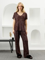 Костюм женский, предназначен для повседневной носки. Костюм женский, 2-х предметный блузка и брюки. Блузка женская, удлинённая прямого силуэта, длиной до середины колена. Перед с 25-мя нагрудными вытачками, выходящими из плечевых швов, с 2-мя накладными прямоугольными карманами на уровне груди, левый декорирован пришивным украшением, с 2-мя притачными вертикальными планками по горловине и краю борта. Спинка с отрезной кокеткой и встречной складкой по центру. Горловина с V-образным фигурным вырезом с втачным воротником рубашечного типа с отрезной стойкой. Застёжка центральная на 5-ть вертикально-обмётанных петель и 5-ть пришивных пуговиц. Боковые швы с высокими разрезами. Рукав втачной одно шовный длиной 7/8 с патой, фиксирующейся на пришивную пуговицу и регулирующей длину рукава. Блузка с плечевыми накладками. Брюки женские прямые широкие длинные. Передние половинки с карманами в боковых швах с отрезными бочками. Задние половинки с таллиевыми вытачками. Брюки с притачным поясом, собранным на эластичную тесьму, закреплённую 2-мя отделочными строчками. Длина брюк по боковому срезу 106 см. Длина спинки туники 100 см, длина рукава 50 см.