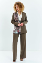 Костюм женский, 2-х предметный, блузка и брюки. Блузка женская, прямого силуэта, длиной ниже линии бёдер, с фигурным низом "ступенька". Перед цельнокроенный, с настрочным декором слева, с настрочной отделочной тесьмой. Спинка цельнокроенная. Горловина круглая, обточная, без воротника, длиной до локтя с притачной манжетой из отделочной ткани. Боковые швы с разрезами. Блузка без плечевых накладок. Брюки женские, прямые, длинные. Передние половинки с карманами в боковых швах. Задние половинки без конструктивных особенностей. Брючки с притачным поясом, собранным на эластичную тесьму (частично) и закреплённую 2-мя отделочными строчками. Длина спинки блузки 68,5 см, длина рукава 49 см. Длина брюк 105 см.