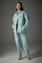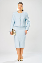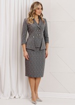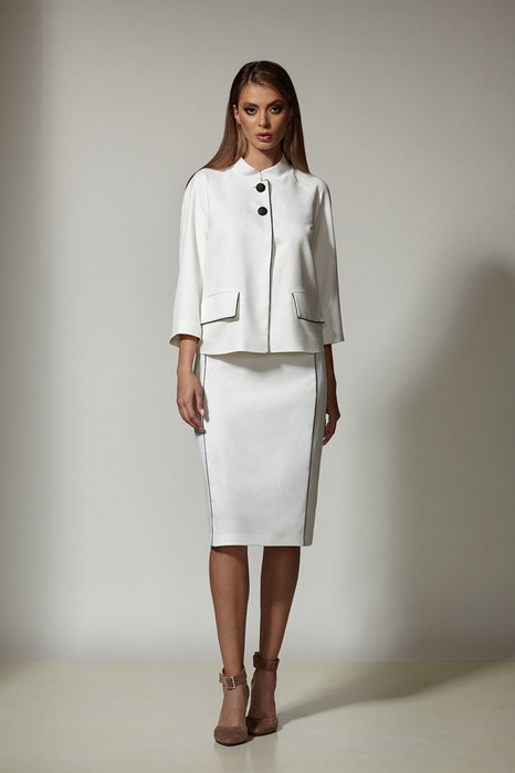 Комплект из костюмной ткани на подкладке, состоящий из жакета и юбки. Жакет прямого силуэта с нагрудными вытачками и прорезными карманами с клапанами. Воротник - стойка. Рукава - реглан, трехчетвертные. Жакет застегивается на пришивные кнопки. Юбка на подкладке, слегка зауженная к низу, с рельефами и поясом. В среднем шве заднего полотнища юбки - застежка-молния и шлица. Кант по краю борта, клапанам и рельефам юбки, отделочные пуговицы по жакету добавят стиля и элегантности.