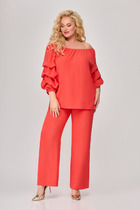 Комплект из костюмной ткани на подкладке, состоящий из жакета и юбки. Жакет прямого силуэта с нагрудными вытачками. Воротник - стойка. Рукава - реглан, трехчетвертные. Жакет застегивается на пришивные кнопки. Юбка на подкладке, с отлетной деталью и поясом-обтачкой. Отделочные настрочные детали по жакету и юбке. В среднем шве заднего полотнища юбки - застежка-молния и разрез.