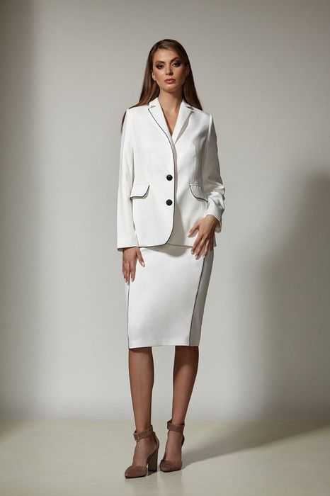 Комплект из костюмной ткани на подкладке, состоящий из жакета и юбки. Жакет приталенного силуэта с прорезными карманами с клапанами по переду. Воротник-английский, рукава - двухшовные. Застегивается на две пуговицы.  Юбка на подкладке, слегка зауженная к низу, с рельефами и поясом.  В среднем шве заднего полотнища юбки - застежка-молния и шлица. Кант по краю борта, клапанам и рельефам юбки добавляет стиля и элегантности.