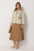 Комплект из костюмной ткани на подкладке, состоящий из жакета и юбки. Жакет приталенного силуэта. Верхняя часть переда с рельефами, вытачками. В левой части переда - прорезной карман в рамку. В правой нижней части переда отлетная деталь, застегивающаяся на пуговицу. Спинка с рельефами, отрезная по линии талии. Жакет застегивается на пуговицу и внутреннюю кнопку. Жакет декорирован цветными булавками. Юбка на подкладке, слегка зауженная к низу, без пояса. Верх юбки обработан обтачкой. В рельефе юбки разрез, обеспечивающий свободу движения и щель, декорированная булавкой. Застежка - молния в среднем шве юбки.