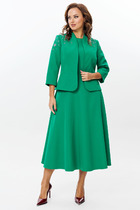 Классический брючный комплект из костюмной ткани на подкладке. Жакет приталенного силуэта с прорезными карманами с клапанами по переду. Воротник-английский, рукава - двухшовные.    Брюки-клеш  расширены к низу, с началом расширения выше колена 5 см. Брюки с двумя  карманами округлой формы  и поясом-обтачкой.  Застегиваются на молнию по переду и  одну пуговицу.