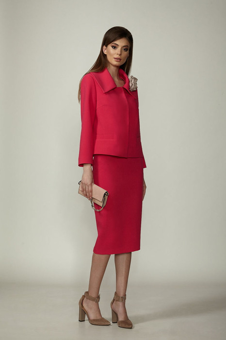 Комплект из костюмной ткани на подкладке, состоящий из жакета и юбки. Жакет прямого силуэта с нагрудными вытачками и прорезными карманами с листочками по переду. Воротник - широкий с отрезной стойкой, рукава – двухшовные, длиной 7/8. Застегивается на пришивные кнопки.  На воротнике жакета - цветок ручной работы. Юбка на подкладке, слегка зауженная к низу, без пояса. Верх юбки обработан обтачкой. Шлица в среднем шве заднего полотнища юбки обеспечит свободу движения. Застежка - молния в среднем шве юбки.