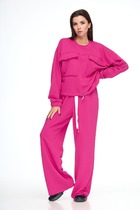 Комплект женский, состоящий из жакета и брюк, выполнен из стрейчевой костюмной ткани на подкладке. Жакет полуприталенного силуэта с рельефами по переду и спинке, отрезной по линии талии, с баской. Карманы-эмитация. Воротник - пиджачного типа. Рукава - втачные, двухшовные. Застежка на 2 пуговицы. Съемная брошь-цветок входит в комплект. Брюки слегка заужены к низу, с поясом. Застегиваются на молнию по переду и одну пуговицу.