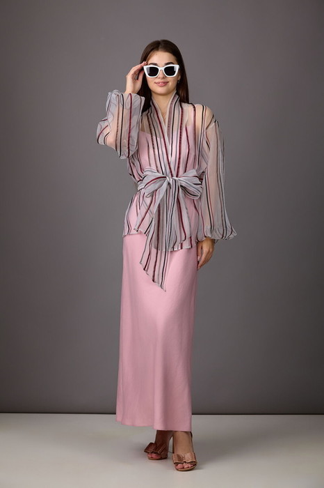 Комплект, состоящий из блузы и платья-комбинации. Прозрачная блуза из вуали немного расширена к низу, с планкой по горловине и бортам. Рукава-балон. Завязывается на пояс. Платье-комбинация из плотного атласа. Крой выполнен по косой, что обеспечит великолепную посадку на фигуре. Бретели регулируемые.