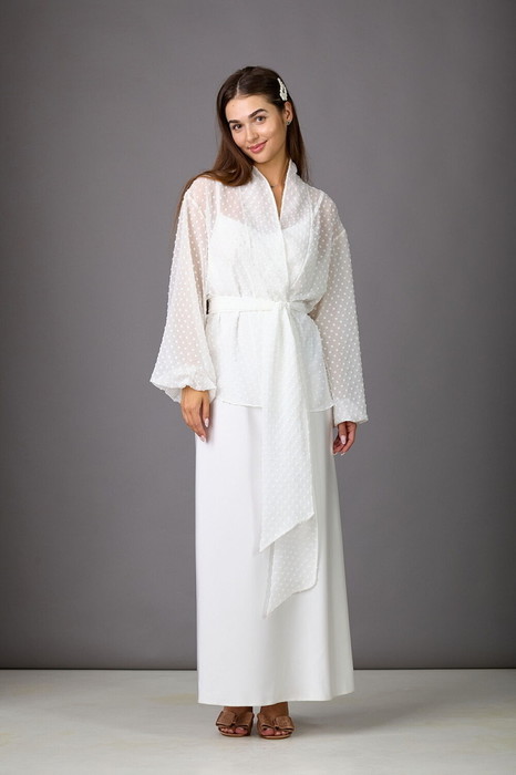 Комплект, состоящий из блузы и платья-комбинации. Прозрачная блуза из вуали немного расширена к низу, с планкой по горловине и бортам. Рукава-балон. Завязывается на пояс. Платье-комбинация из плотного атласа. Крой выполнен по косой, что обеспечит великолепную посадку на фигуре. Бретели регулируемые.