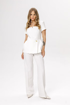 Брючный костюм из костюмной ткани на подкладке. Жакет приталенного силуэта с прорезными карманами с клапанами по переду. Воротник-английский, рукава - двухшовные. Застегивается на две пуговицы. Брюки слегка заужены к низу, с поясом. Посадка- средняя. Застегиваются на молнию по переду и одну пуговицу. Серебряный кант по краю борта, клапанам и боковым швам брюк добавит стиля и элегантности.