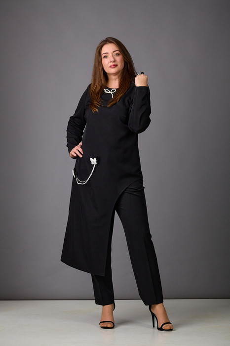 Роскошный комплект из стрейчевой костюмной  ткани, состоящий из блузы и брюк.  Асимметричная блуза  с вытачками по переду и спинке. Рукава втачные, длинные. Блуза застегивается на молнию в среднем шве спинки. Брюки слегка заужены к низу, с поясом. Посадка-средняя. Застегиваются на молнию по переду и одну пуговицу.