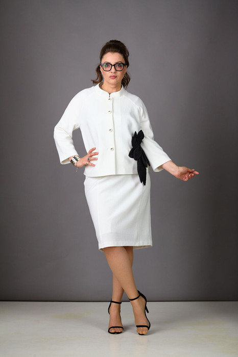 Новинка на весну -комплект на подкладке из стрейчевой ткани с эффектом креша молочного цвета!  Только представьте, как изысканно вы будете смотреться в этом стильном изделии! Жакет прямого силуэта с воротником-стойкой и карманами с клапанами. Рукава-реглан, трехчетвертные. Застежка на пуговицы.  Юбка прямого силуэта, немного зауженная к низу, с поясом с резинкой. В среднем шве-молния и шлица.