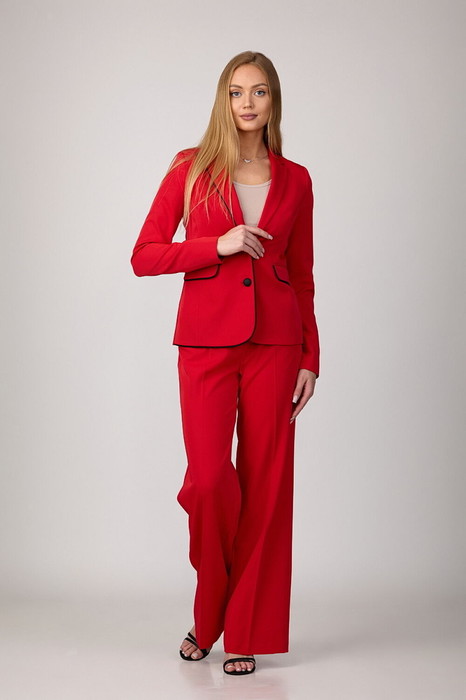 Классический брючный комплект из костюмной ткани на подкладке. Жакет приталенного силуэта с прорезными карманами с клапанами по переду. Воротник-английский, рукава - двухшовные. Кант по краю борта, клапанам   добавит  стиля и элегантности. Застегивается на две пуговицы.  Брюки прямые со складкой, широким поясом-обтачкой, наклонными карманами. Застегиваются на молнию по переду  и пуговицу.