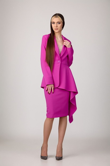 Жакет приталенного силуэта с рельефами по переду и спинке, отрезной по линии талии, с роскошной асимметричной баской. Воротник с отложными лацканами пиджачного типа. Рукава - втачные, двухшовные. Жакет застегивается на одну пуговицу.