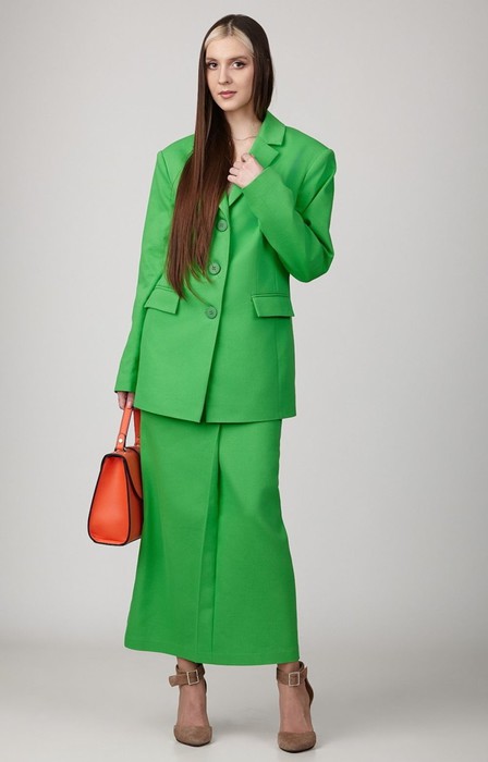 Комплект, состоящий из жакета и юбки,  из джинсовой ткани на подкладке.  Жакет с расширенной линией плеч, с отрезными бочками по переду и спинке и вытачками по переду. Воротник-с отложными лацканами пиджачного типа. По переду - прорезные  карманы  с клапанами. Рукава длинные, двухшовные. Жакет застегивается на три пуговицы. Юбка- миди с наклонными карманами и складкой по переду, с широким поясом-обтачкой. Застегиваются на молнию спереди и пуговицу.